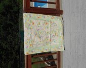 This blanket is made with soft muted yellows, pinks and greens. The prints have balloons and clouds on yellow fabric, as well as muted zoo animals on a cream fabric. This blanket measures 33 1/2 X 49 inches. The batting is All natural 100% needle punched cotton. The fabric used is snuggle flannel so this blanket will keep your precious bundle of joy warm and be soft against her skin.