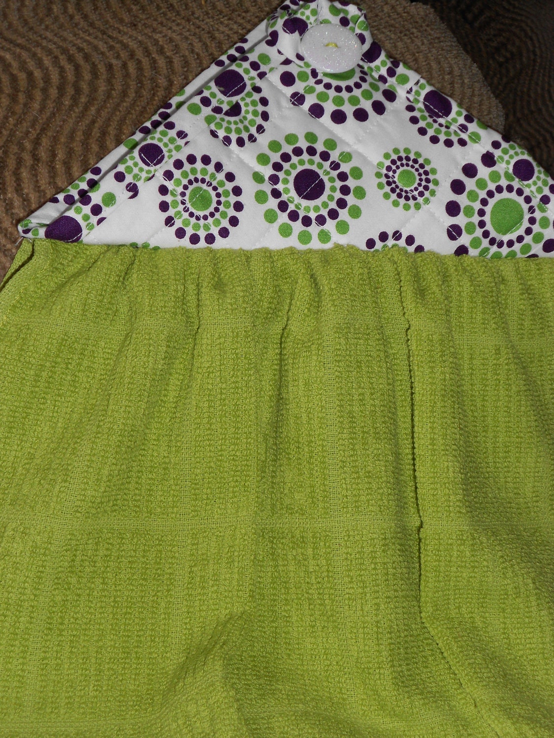 This hanging towel was made with a folded purple and green polka dot circles potholder and a lime green kitchen towel. The pot holder is held together with a white glitter button button. The circles sit on top of white fabric.