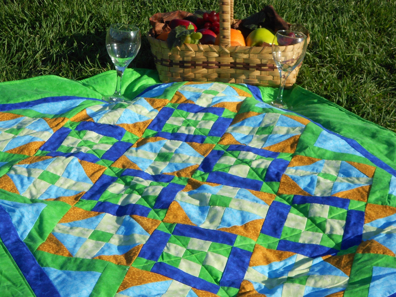 This Lap Blanket is made up of Greens, Blues, and Yellow fabrics. It measures to be 41 X 49 inches. The batting is 100% All Natural Needle Punched Cotton batting.