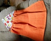 This hanging towel was made with a folded fiesta fruit potholder and an orange kitchen towel. The pot holder is held together with a glitter button. The fruit sit on top of white fabric.