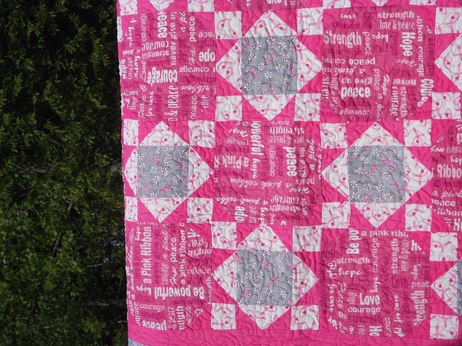 This blanket was made with Love, Hope and Support. We used Pink Inspirational fabric in making this Breast Cancer Awareness Lap Quilt. This is a great blanket to bring to the hospital with you or to curl up on the couch with.