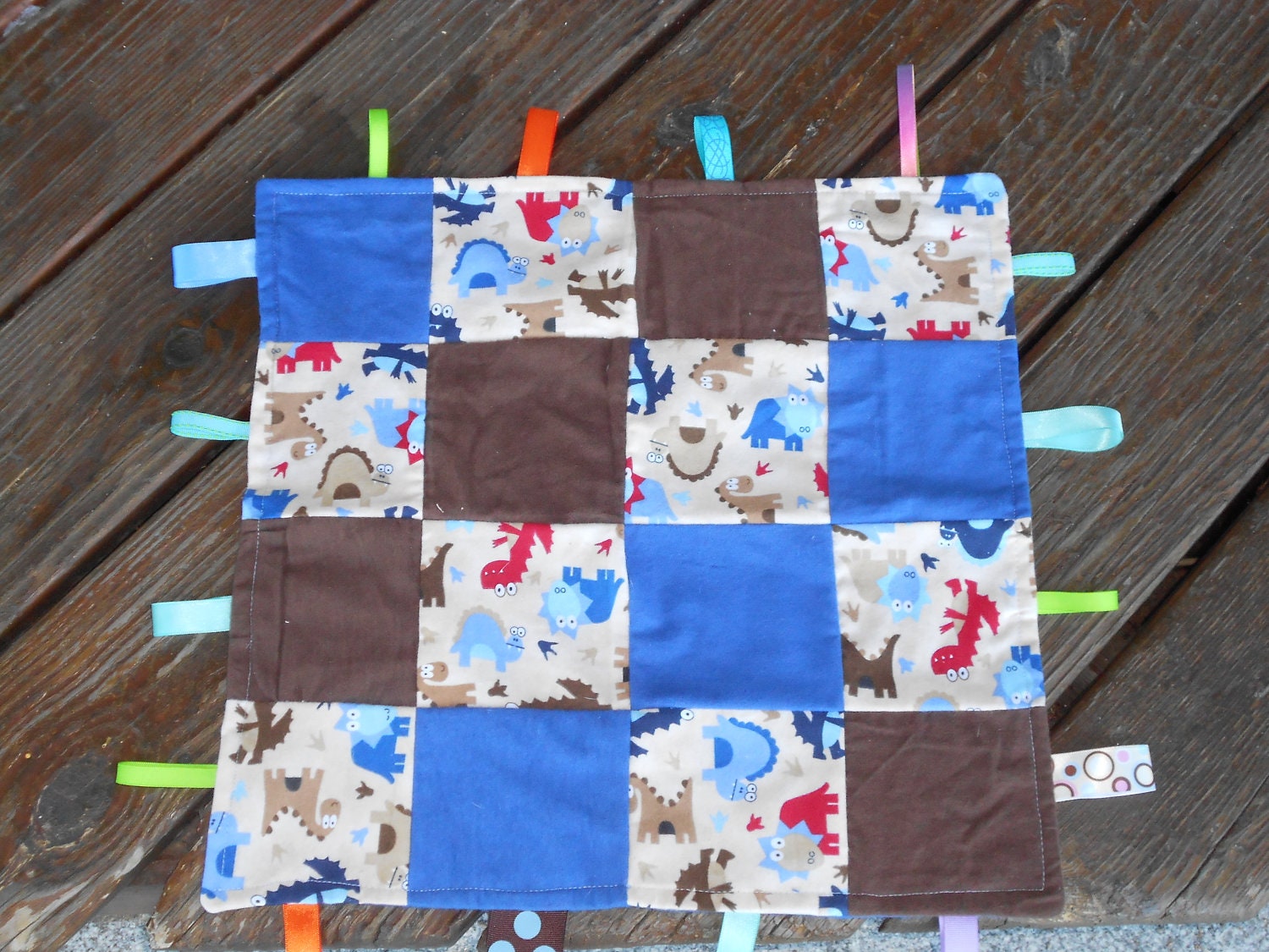 This Quilted Patchwork Taggie is made of Cotton Flannel and different textured ribbons. It measures to be about 17 X 17 inches not including ribbons. It is backed with flannel. I used a Multi-directional Dinosaur Print, Brown and Blue Soft Flannel. On the back of the Brown Flannel I added Crinkle material.