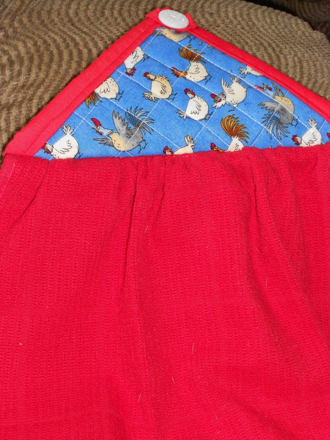 This hanging towel is made from a folded Blue Chicken potholder and a red terry cloth towel. The potholder has random scattered chickens all over it. It is banded together with red binding and held up with a red glitter button. The batting used in the potholder is All Natural 100% Cotton Needle Punched batting.