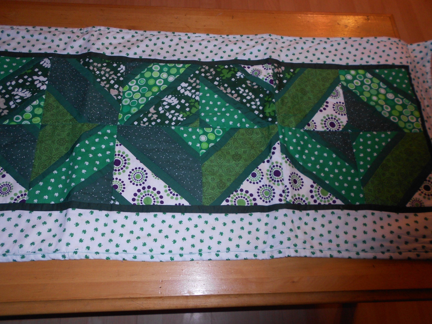 This table is runner is made of different shades of green and St. Patrick's Day fabric. The strips of fabric were sewn on the diagonal and the cut to form diamonds. Surrounding the three diamonds is a strip of tiny shamrock fabric. The batting used i...